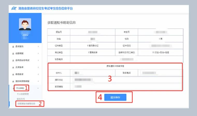 考生通过系统左侧的【个人中心】→【录取通知书邮寄信息】按要求填写收件人、邮寄地址、邮政编码等信息。