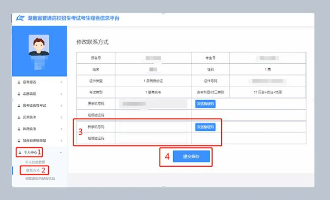 成功登录进入系统后,考生须通过系统左侧【个人中心】→【联系方式】,按要求绑定手机号码。