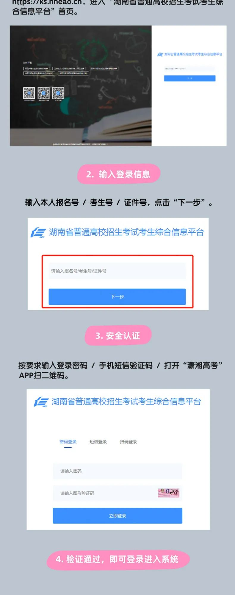 考生进入湖南省普通高校招生考试考生综合信息平台,输入报名号/考生号/证件号,然后再输入登录密码/手机验证码,登录进入系统。