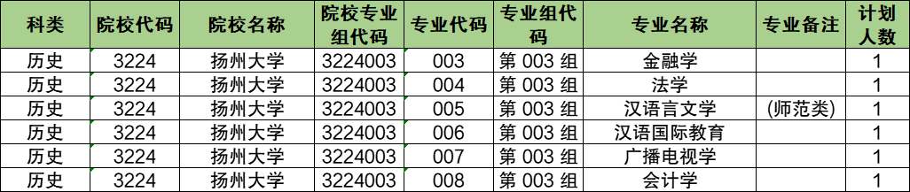 第003组:专业组代码为3224003,包含专业金融学、法学、汉语言文学、汉语国际教育、广播电视学、会计学。