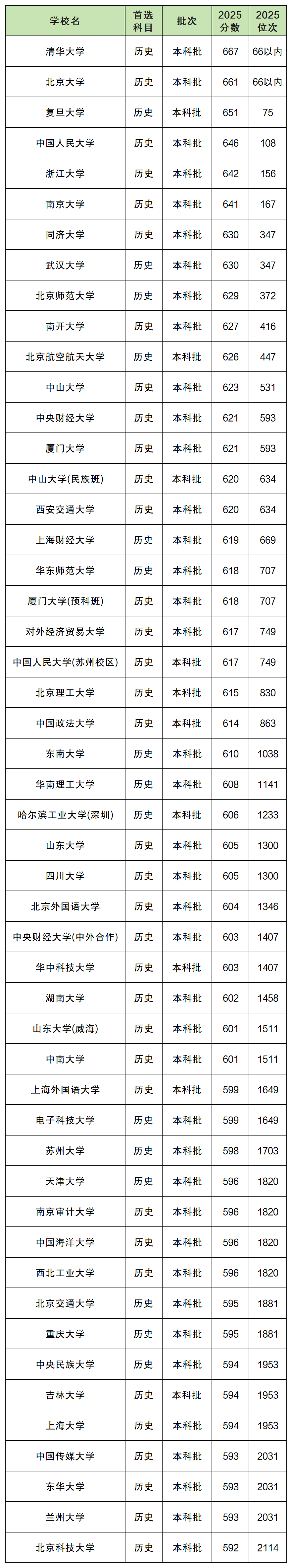 2025年全国一本大学在重庆历史类分数线前50强名单: