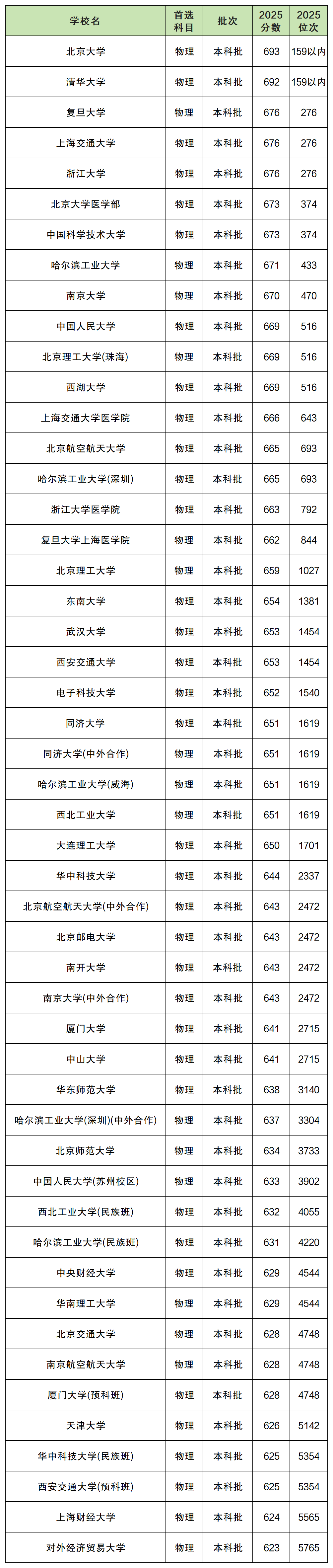 2025年全国一本大学在重庆物理类分数线前50强名单: