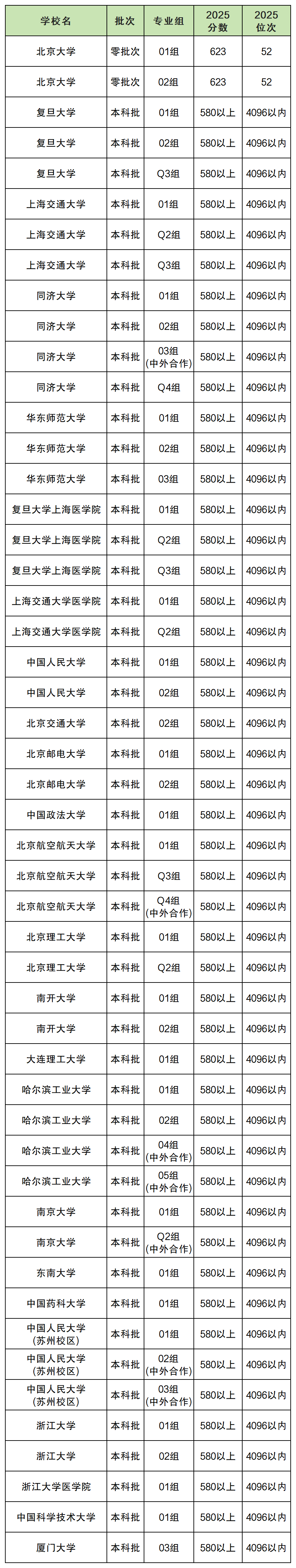 而分数线排在第二位的有复旦大学01组、同济大学02组、中国人民大学02组等,2025年投档分数线均为580分以上。
