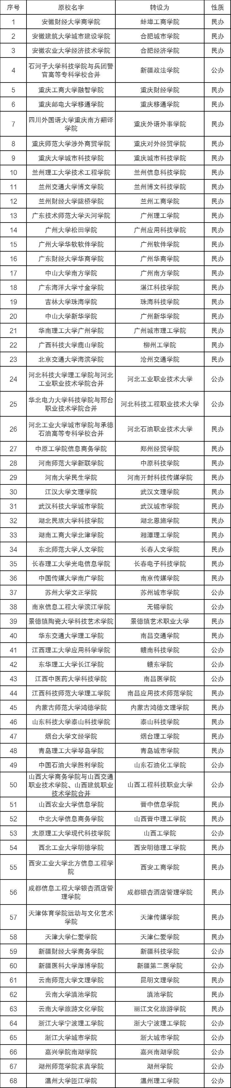 最近,很多同学们和家长都在关注三本转二本的独立院校,截至目前,教育部已同意68所独立学院转设为本科高校,下面小北老师简单给同学们列举一下这些院校。
