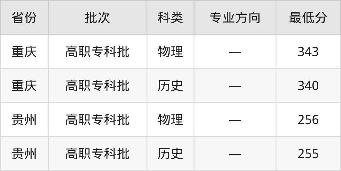 重庆交通职业学院汽车制造类专业录取分数线从255分到343分不等,最低分数线如下: