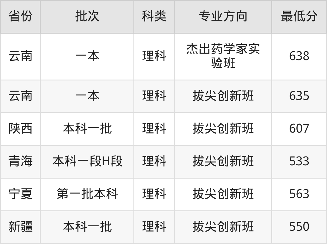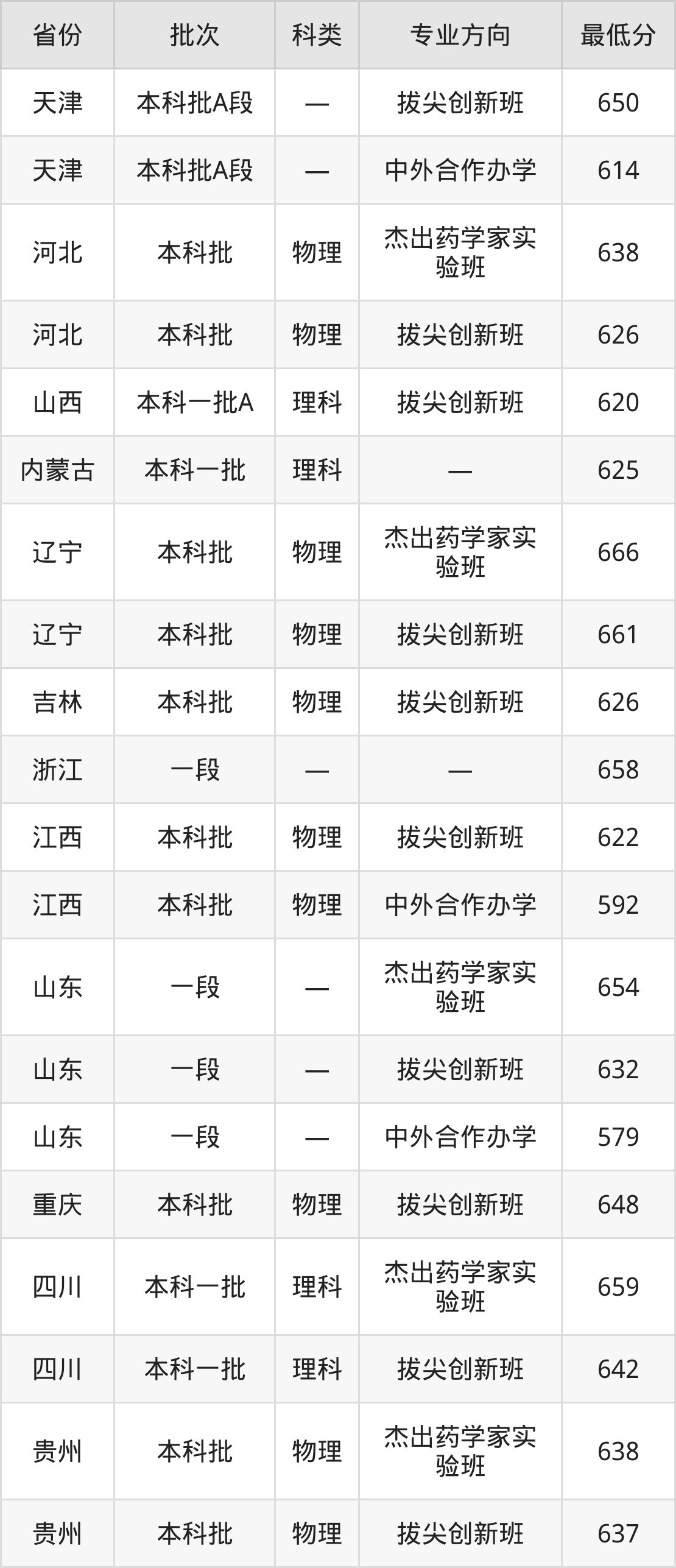 中国药科大学药学专业录取分数线从533分到666分不等,在部分地区的最低分数线如下:
