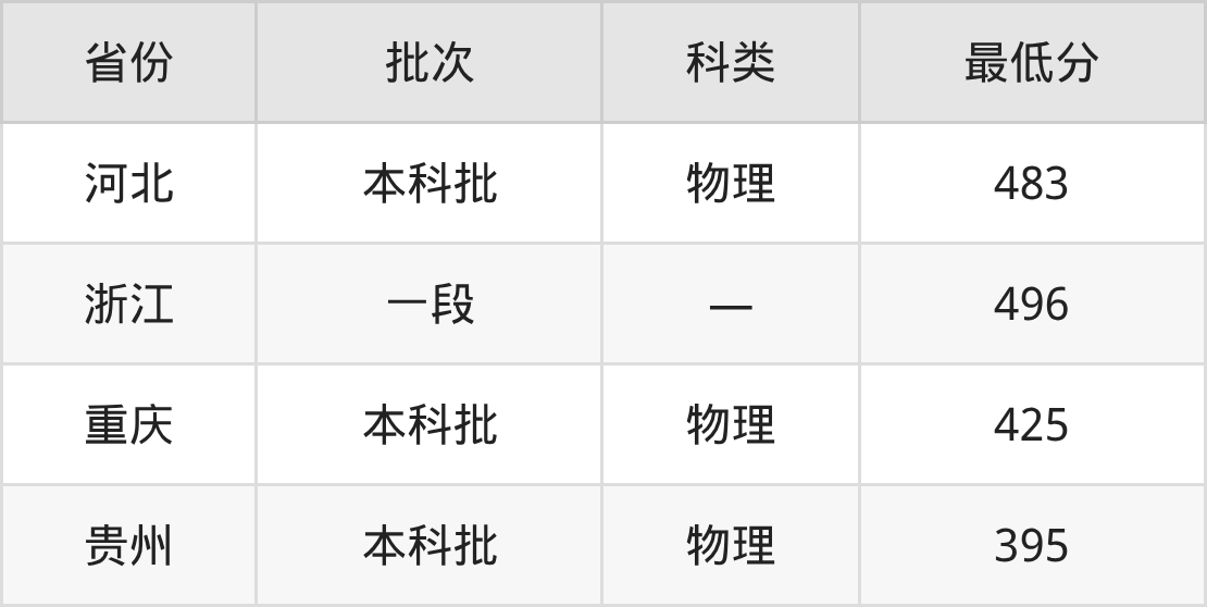 南通理工学院标准化工程专业在全国各省最低录取分数线为395分(贵州物理类),除此之外,在其余地区的最低分为浙江496分、重庆物理类425分、河北物理类483分,以上数据均为2025年数据,供2026年高考生参考。