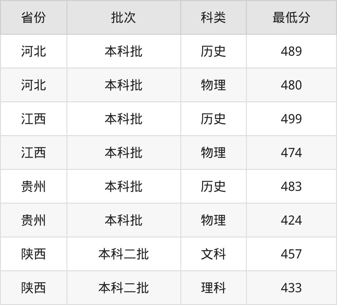 中南林业科技大学涉外学院英语专业在全国各省最低录取分数线为424分(贵州物理类),除此之外,在其余地区的最低分为江西物理类474分、陕西理科433分、河北物理类480分,以上数据均为2024年数据,供2025年高考生参考。