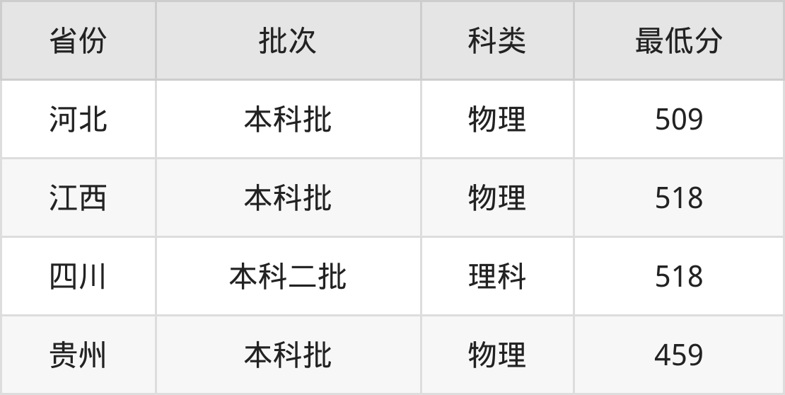 福建江夏学院智能建造专业在全国各省最低录取分数线为459分(贵州物理类),除此之外,在其余地区的最低分为江西物理类518分、四川理科518分、河北物理类509分,以上数据均为2024年数据,供2025年高考生参考。