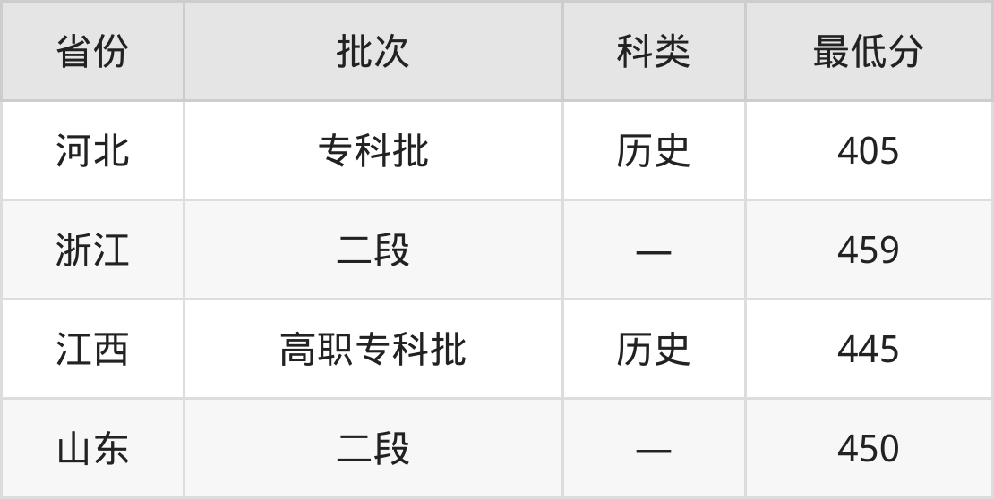 徐州生物工程职业技术学院大数据与会计专业在全国各省最低录取分数线为405分(河北历史类),除此之外,在其余地区的最低分为浙江459分、江西历史类445分、山东450分,以上数据均为2024年数据,供2025年高考生参考。