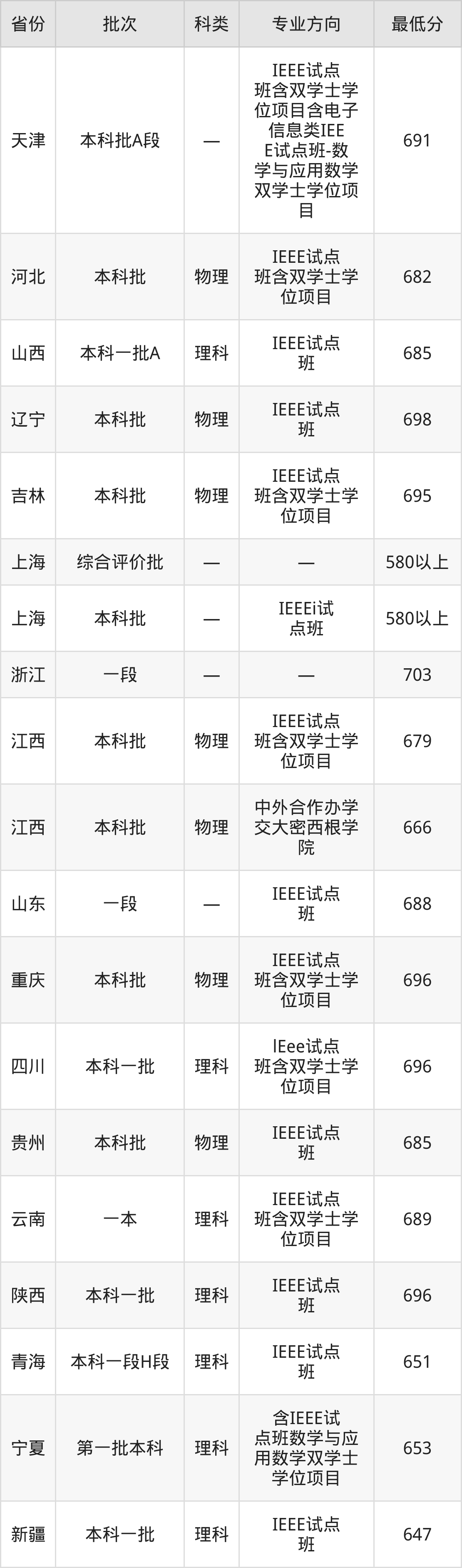 上海交通大学电子信息类专业在全国各省录取分数线: