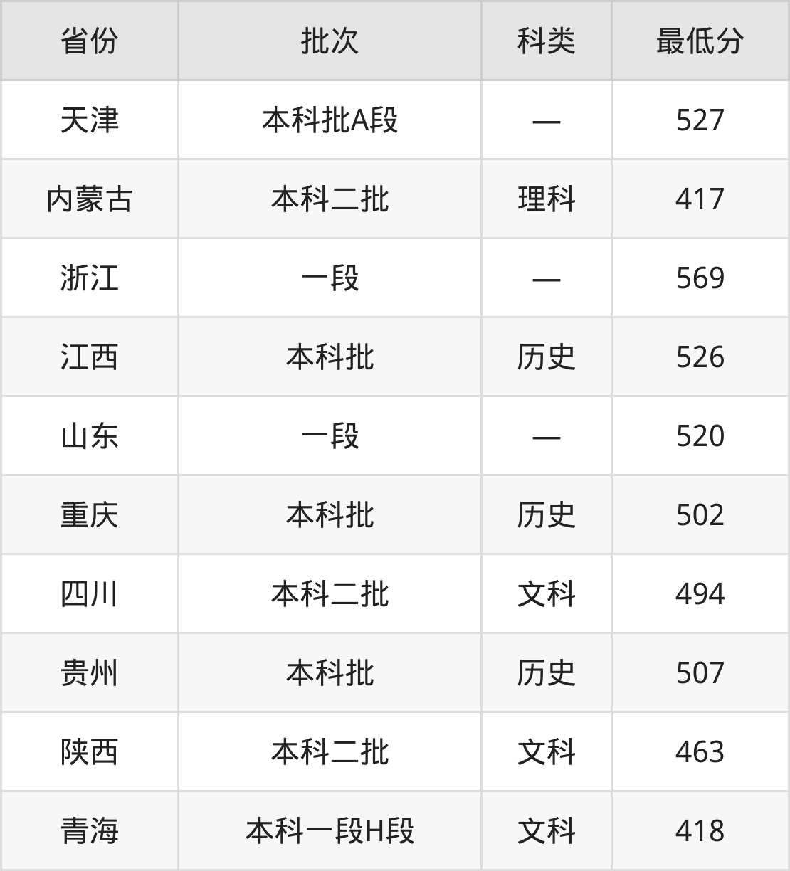 桂林理工大学国际经济与贸易专业在全国各省最低录取分数线为417分(内蒙古理科),除此之外,在其余地区的最低分为浙江569分、江西历史类526分、重庆历史类502分、天津527分等,以上数据均为2024年数据,供2025年高考生参考。