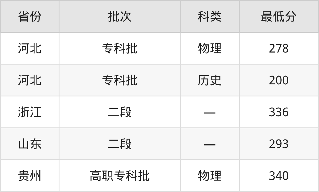 上海东海职业技术学院集成电路技术专业在全国各省最低录取分数线为200分(河北历史类),除此之外,在其余地区的最低分为浙江336分、山东293分、贵州物理类340分,以上数据均为2025年数据,供2026年高考生参考。