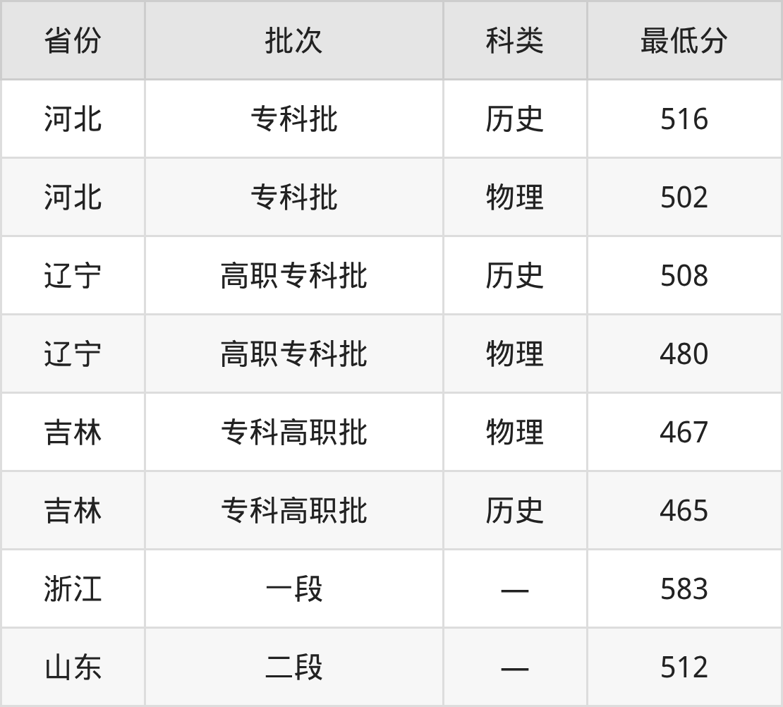 长沙民政职业技术学院现代殡葬技术与管理专业在全国各省最低录取分数线为465分(吉林历史类),除此之外,在其余地区的最低分为山东512分、河北物理类502分、辽宁物理类480分、浙江583分,以上数据均为2025年数据,供2026年高考生参考。