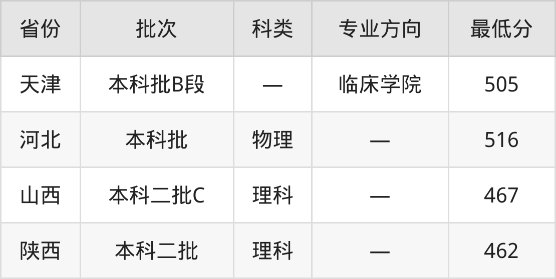河北医科大学临床学院中西医临床医学专业录取分数线从462分到516分不等,最低分数线如下: