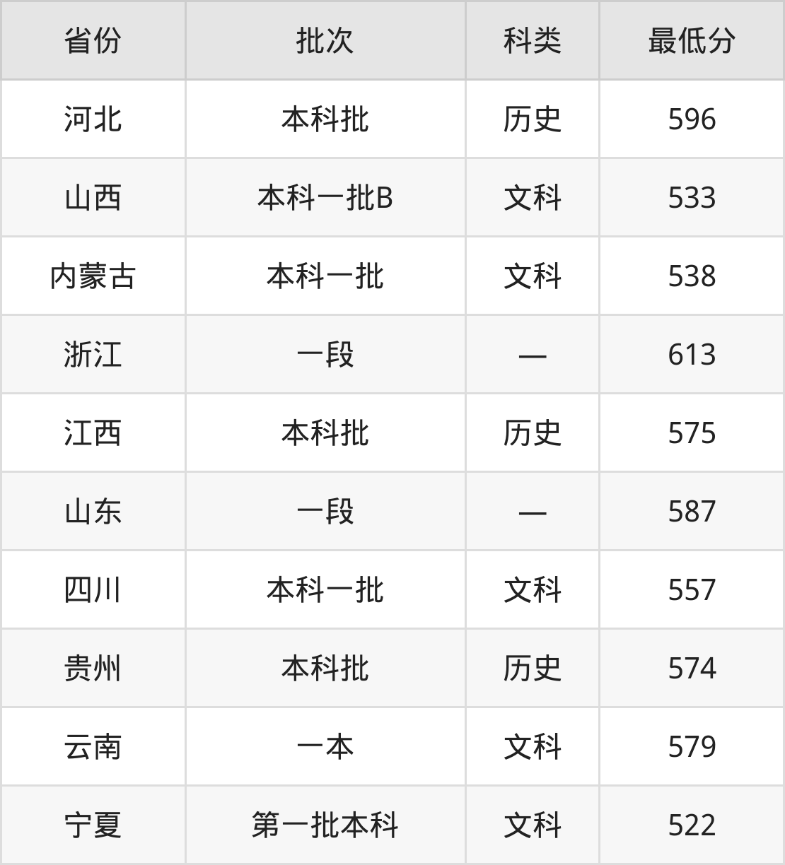 浙江农林大学法学专业在全国各省最低录取分数线为522分(宁夏文科),除此之外,在其余地区的最低分为四川文科557分、贵州历史类574分、云南文科579分、山西文科533分等,以上数据均为2024年数据,供2025年高考生参考。