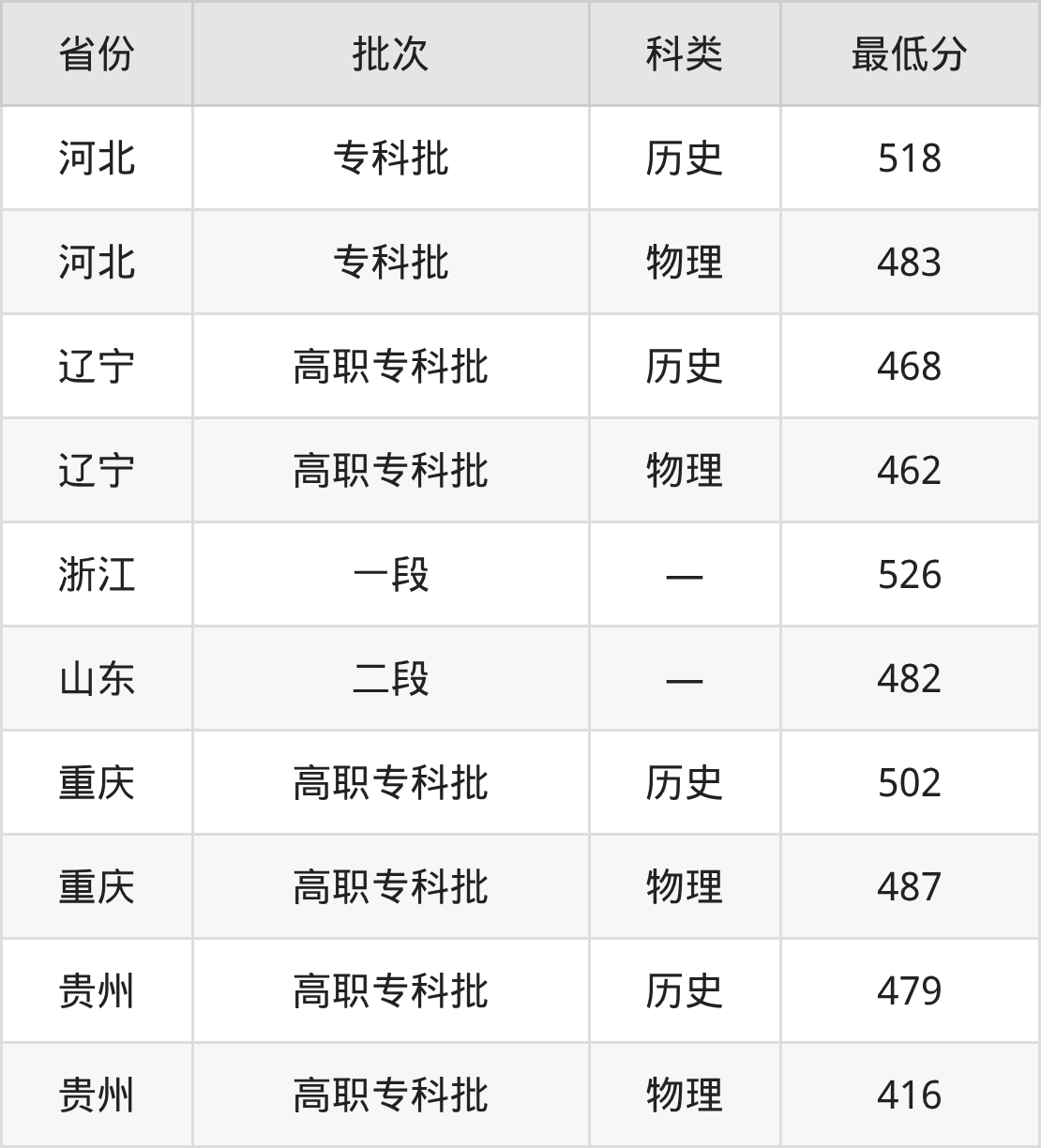 武汉铁路职业技术学院铁道供电技术专业在全国各省最低录取分数线为416分(贵州物理类),除此之外,在其余地区的最低分为河北物理类483分、辽宁物理类462分、浙江526分、山东482分等,以上数据均为2025年数据,供2026年高考生参考。