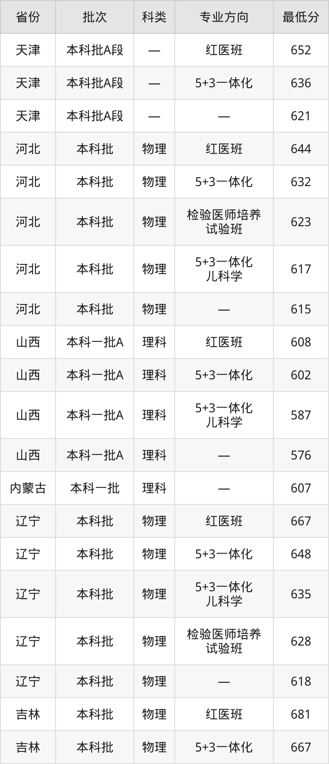 中国医科大学临床医学专业录取分数线从504分到681分不等,在部分地区的最低分数线如下: