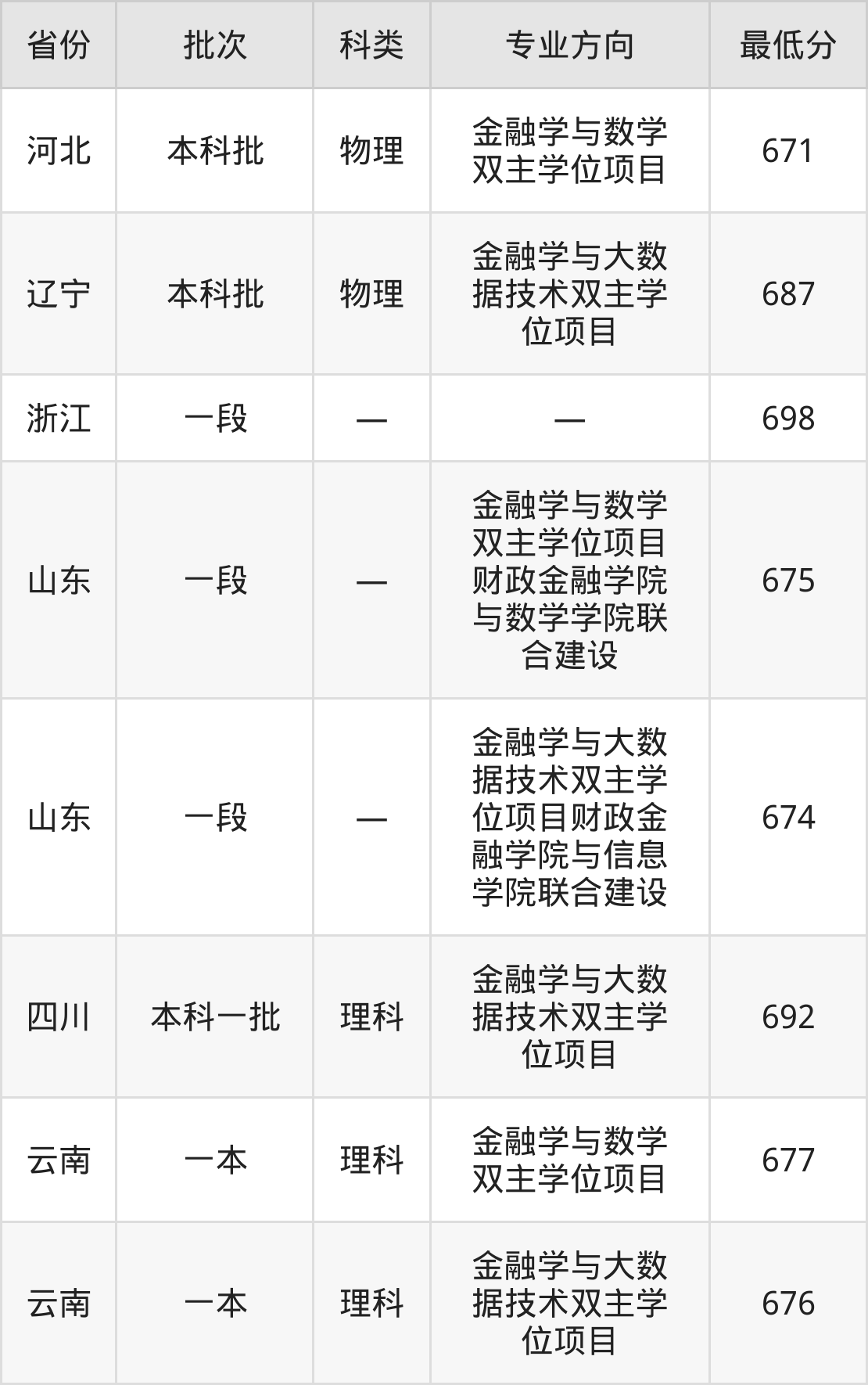 中国人民大学金融学专业录取分数线从671分到698分不等,最低分数线如下: