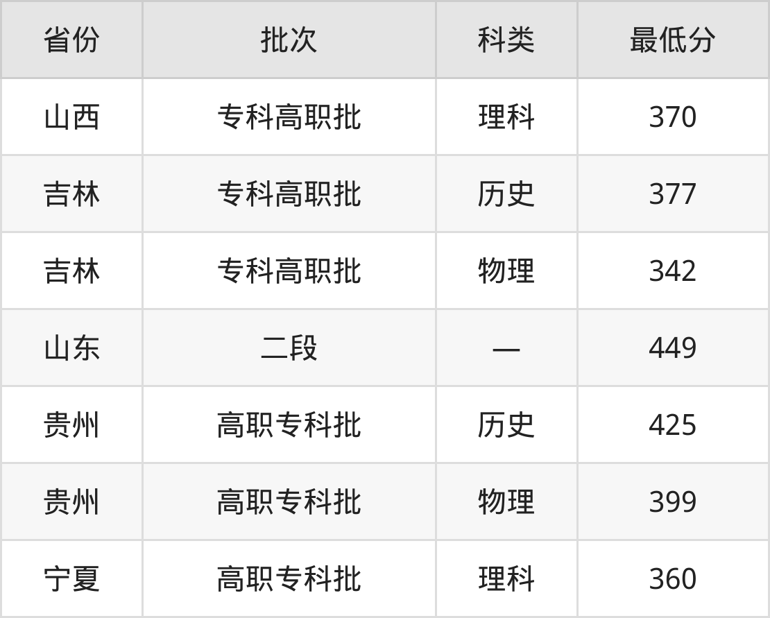 淄博职业技术大学机械制造及自动化专业录取分数线从342分到449分不等,最低分数线如下:
