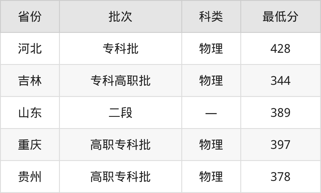 黔南民族医学高等专科学校医学美容技术专业在全国各省最低录取分数线为344分(吉林物理类),除此之外,在其余地区的最低分为河北物理类428分、山东389分、重庆物理类397分、贵州物理类378分,以上数据均为2025年数据,供2026年高考生参考。