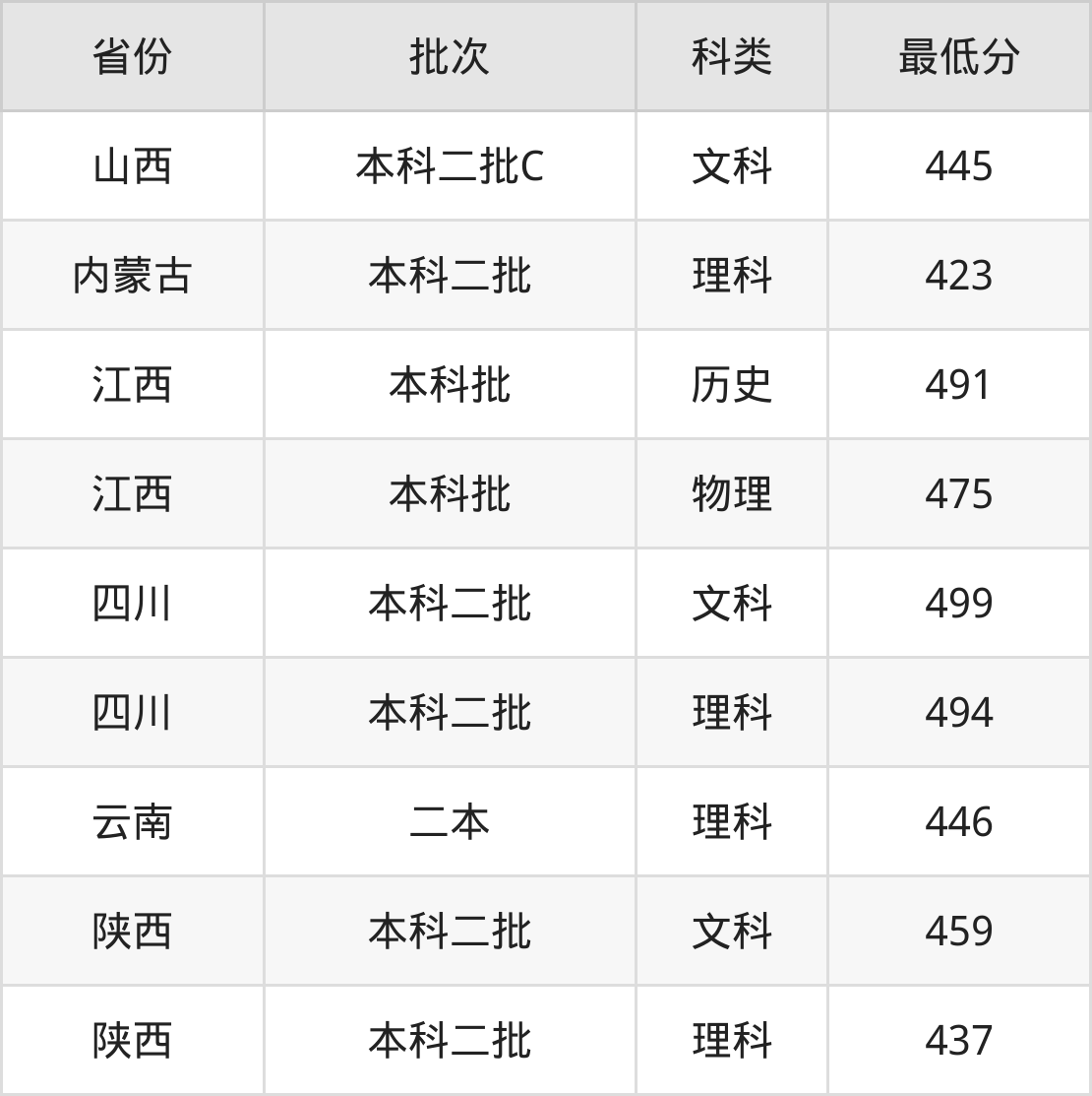 江西农业大学南昌商学院会计学专业在全国各省最低录取分数线为423分(内蒙古理科),除此之外,在其余地区的最低分为云南理科446分、陕西理科437分、山西文科445分、江西物理类475分等,以上数据均为2024年数据,供2025年高考生参考。