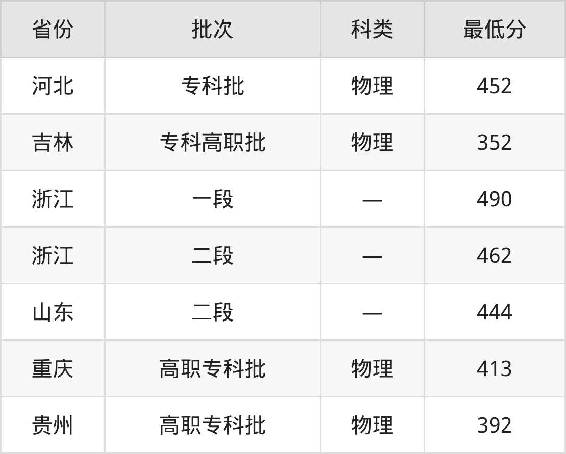 漯河医学高等专科学校临床医学专业在全国各省最低录取分数线为352分(吉林物理类),除此之外,在其余地区的最低分为河北物理类452分、浙江462分、山东444分、重庆物理类413分等,以上数据均为2025年数据,供2026年高考生参考。