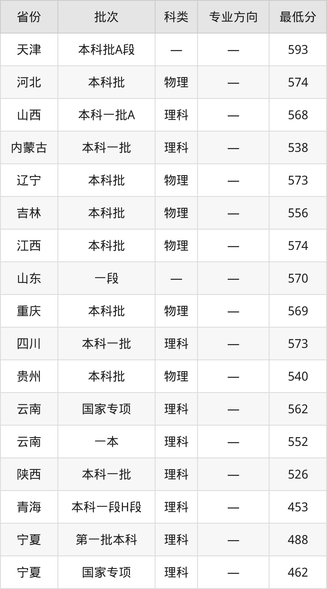 东北农业大学水利类专业录取分数线从453分到593分不等,在部分地区的最低分数线如下: