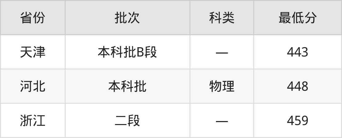 北京金融科技学院数据科学与大数据技术专业在全国各省最低录取分数线为443分(天津),除此之外,在其余地区的最低分为河北物理类448分、浙江459分,以上数据均为2024年数据,供2025年高考生参考。