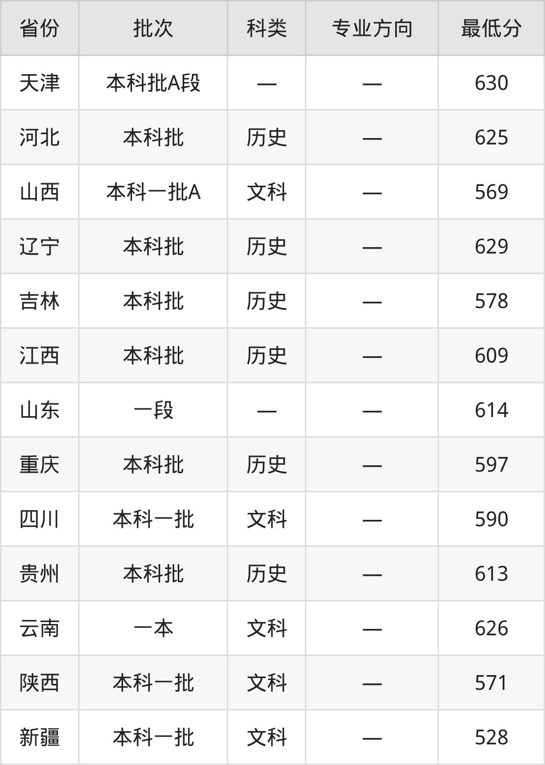西南大学中国语言文学类专业录取分数线从528分到630分不等,在部分地区的最低分数线如下: