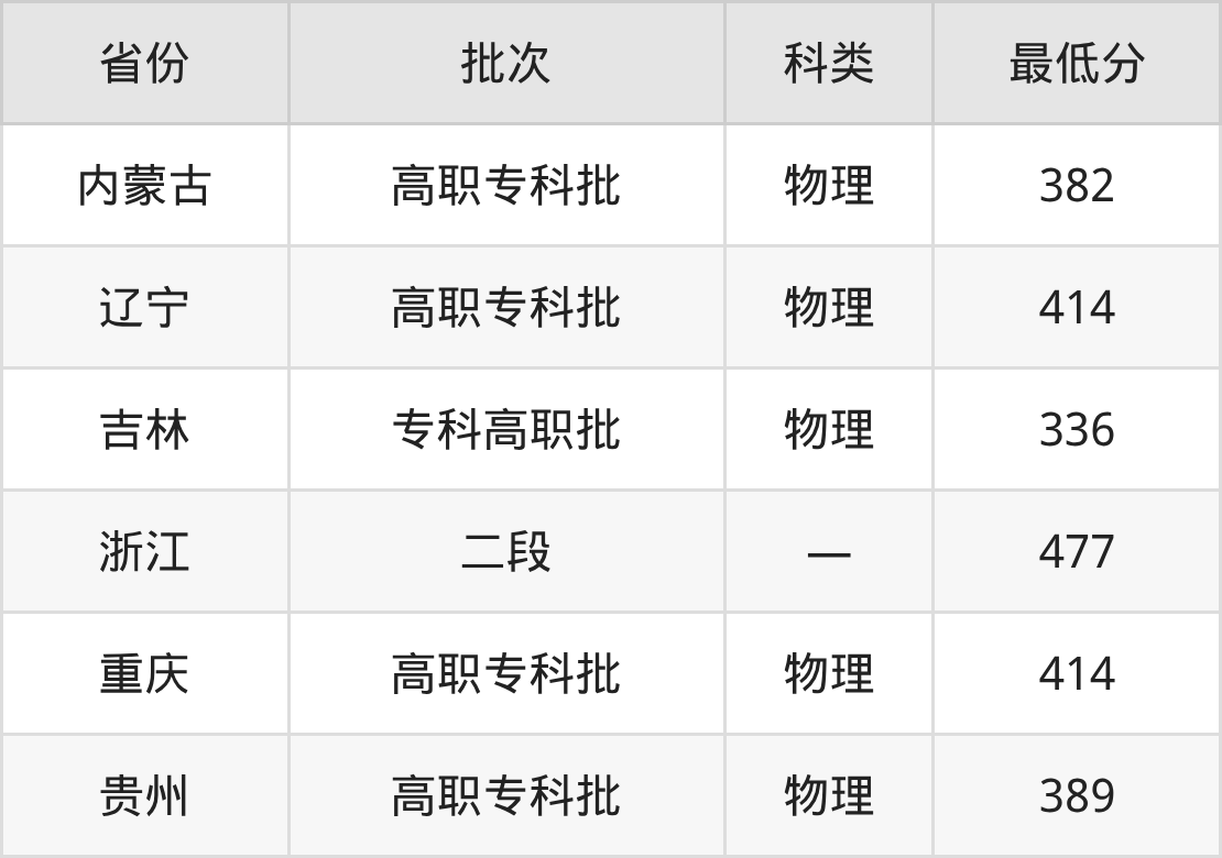 江西医学高等专科学校医学检验技术专业在全国各省最低录取分数线为336分(吉林物理类),除此之外,在其余地区的最低分为浙江477分、重庆物理类414分、贵州物理类389分、内蒙古物理类382分等,以上数据均为2025年数据,供2026年高考生参考。