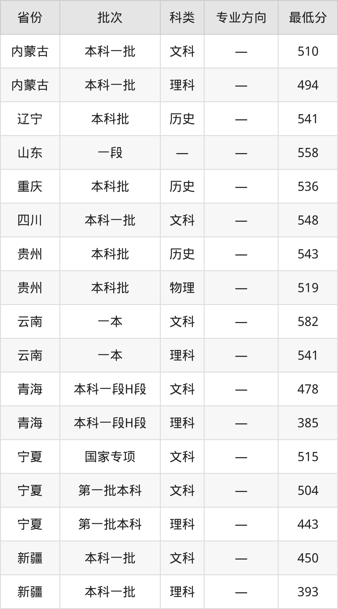中南民族大学公共管理类专业在全国各省最低录取分数线为385分(青海理科),除此之外,在其余地区的最低分为新疆理科393分、内蒙古理科494分、辽宁历史类541分、四川文科548分等,以上数据均为2024年数据,供2025年高考生参考。