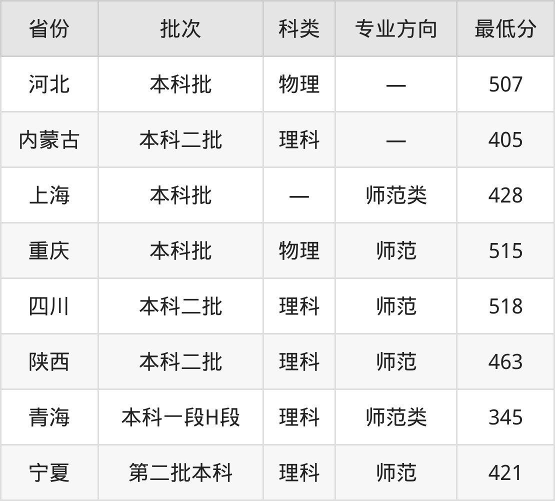 内江师范学院物理学专业录取分数线从345分到518分不等,最低分数线如下: