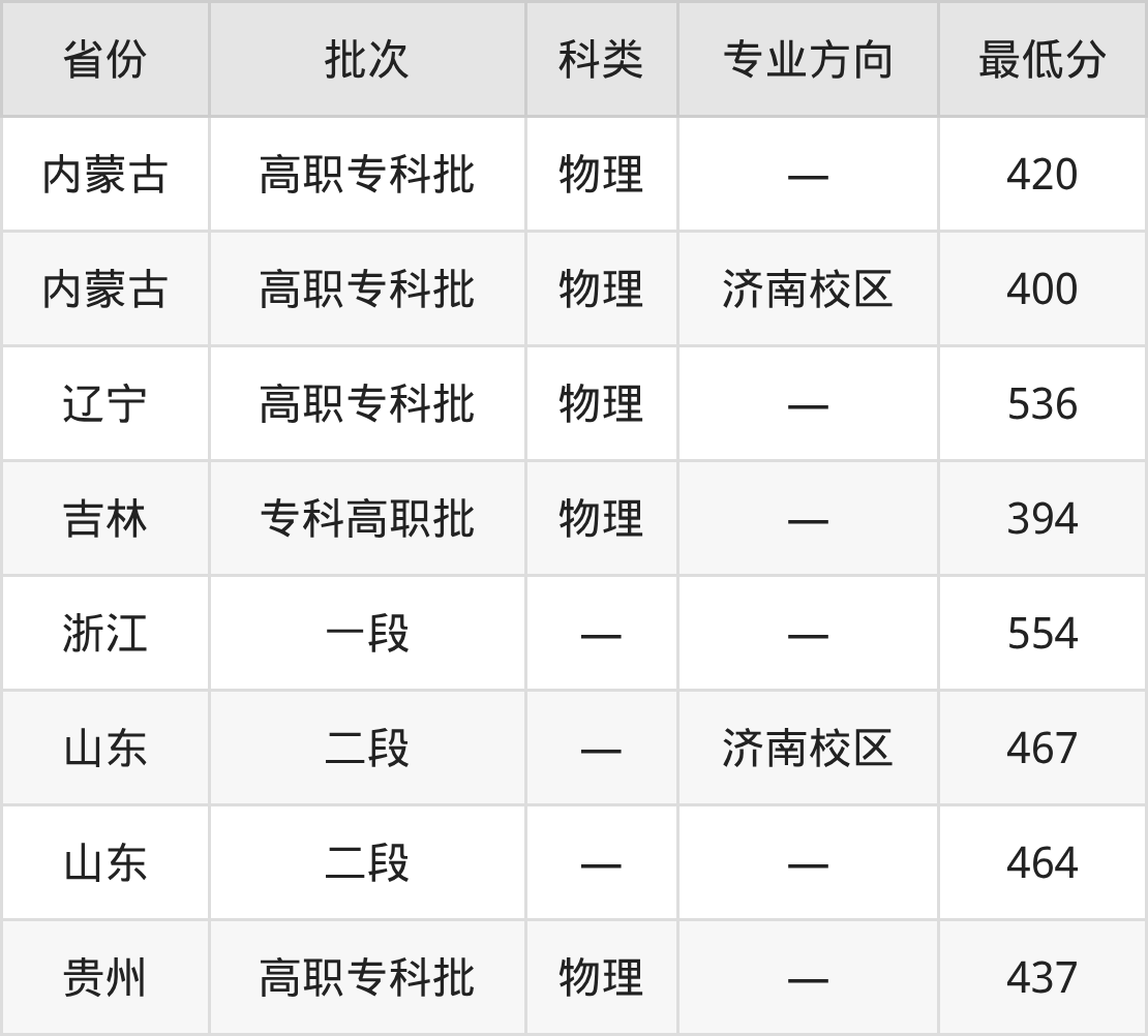 山东医学高等专科学校口腔医学专业在全国各省最低录取分数线为394分(吉林物理类),除此之外,在其余地区的最低分为浙江554分、山东464分、贵州物理类437分、内蒙古物理类400分等,以上数据均为2025年数据,供2026年高考生参考。