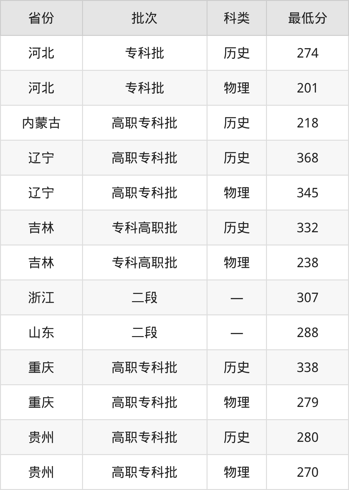 四川西南航空职业学院民航空中安全保卫专业录取分数线从201分到368分不等,最低分数线如下: