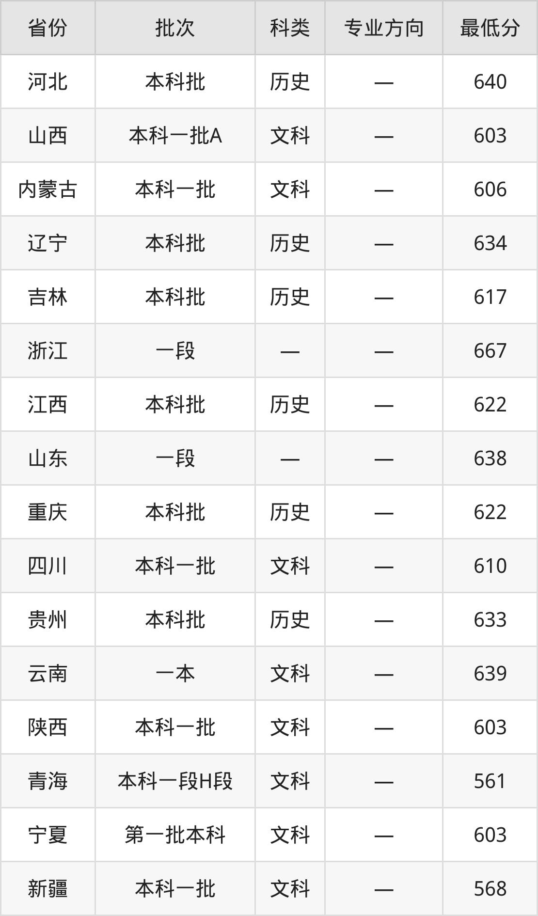 西安交通大学文科试验班类专业录取分数线从561分到667分不等,在部分地区的最低分数线如下:
