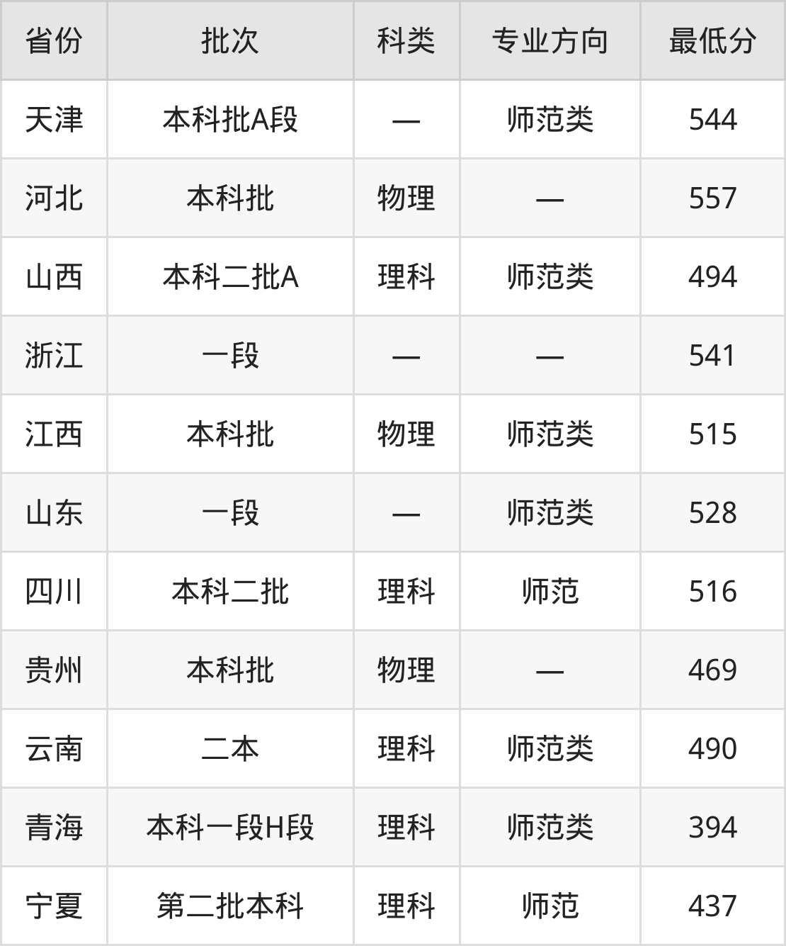 天津职业技术师范大学数学与应用数学专业录取分数线从394分到557分不等,在部分地区的最低分数线如下: