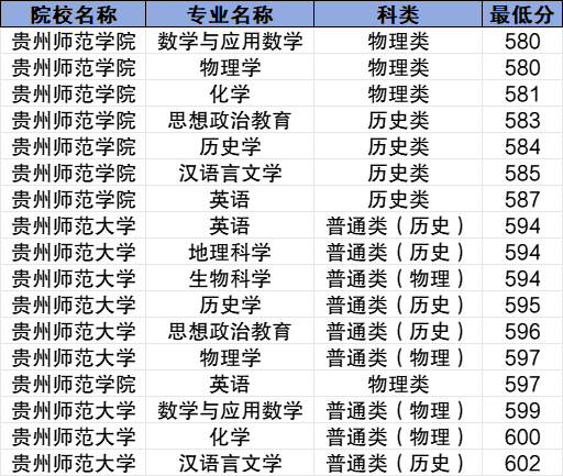 贵州师范学院最低分数线:历史类583分、物理类580分;历史类最低分专业为思想政治教育、物理类最低分专业为数学与应用数学。