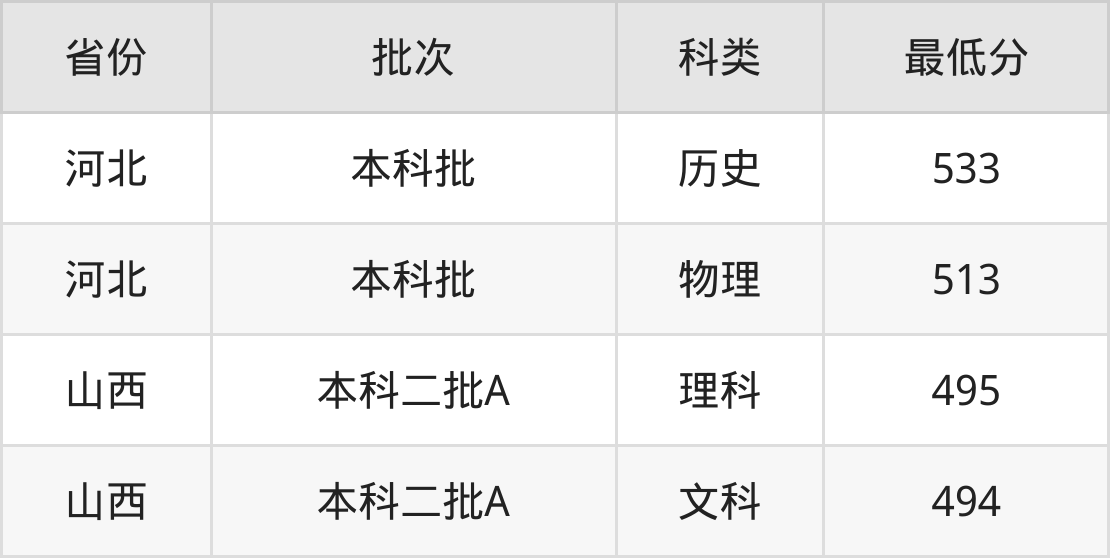 河北经贸大学酒店管理专业在全国各省最低录取分数线为494分(山西文科),除此之外,在其余地区的最低分为河北物理类513分,以上数据均为2024年数据,供2025年高考生参考。