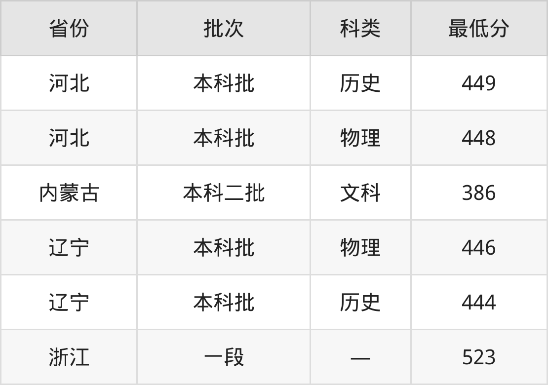 河北外国语学院俄语专业录取分数线从386分到523分不等,最低分数线如下: