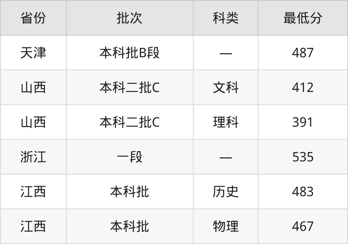 南昌理工学院电子商务专业在全国各省最低录取分数线为391分(山西理科),除此之外,在其余地区的最低分为天津487分、浙江535分、江西物理类467分,以上数据均为2024年数据,供2025年高考生参考。