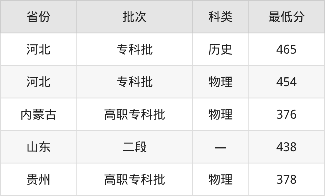 湖北水利水电职业技术学院发电厂及电力系统专业在全国各省最低录取分数线为376分(内蒙古物理类),除此之外,在其余地区的最低分为河北物理类454分、山东438分、贵州物理类378分,以上数据均为2025年数据,供2026年高考生参考。