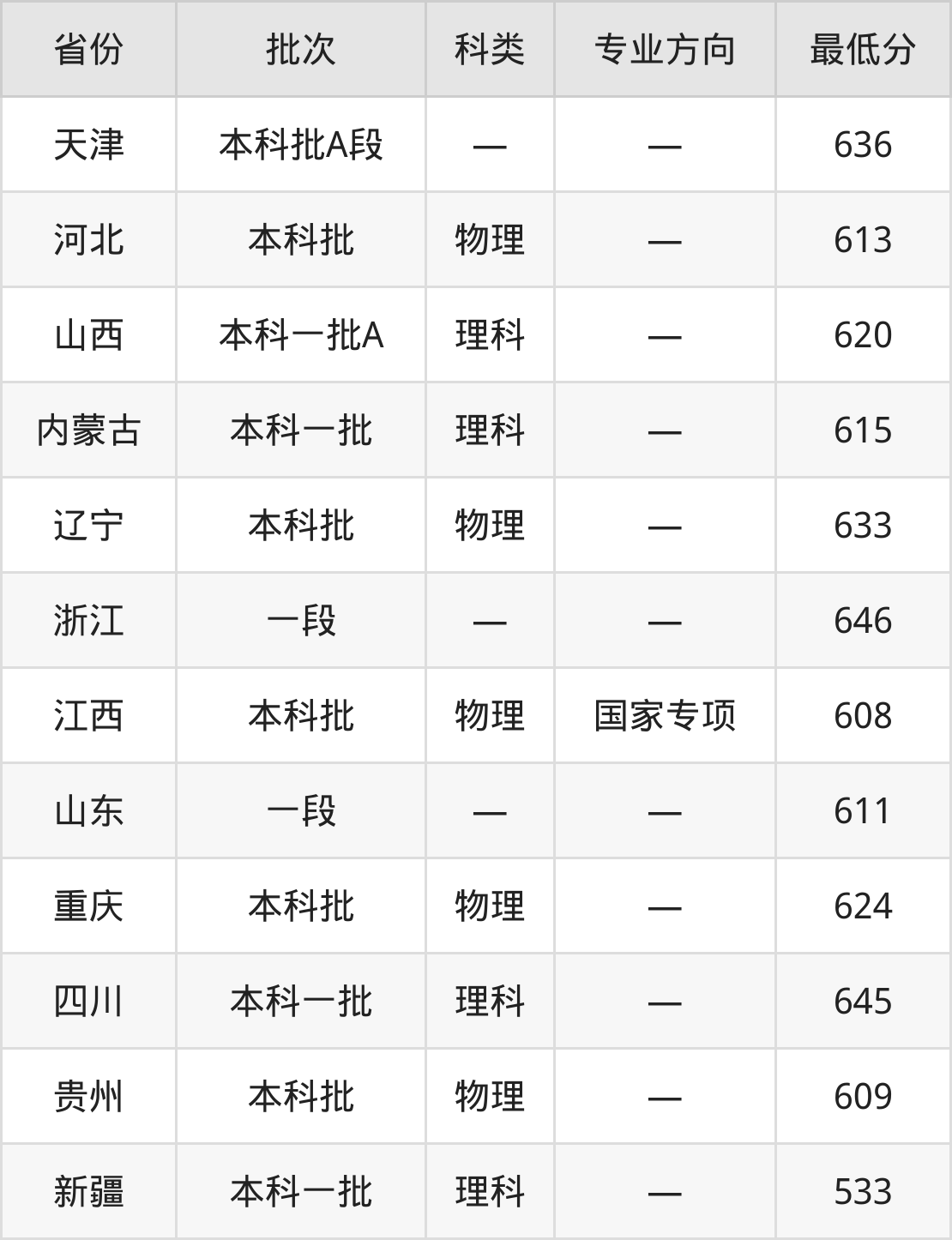 四川大学公共卫生与预防医学类专业录取分数线从533分到646分不等,在部分地区的最低分数线如下: