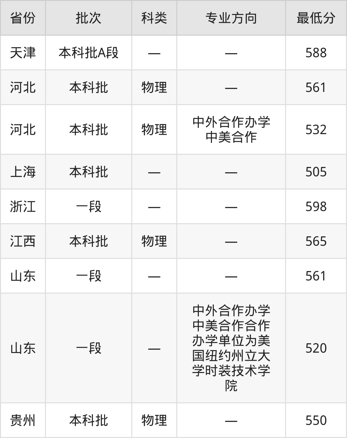 浙江理工大学服装设计与工程专业录取分数线从505分到598分不等,最低分数线如下: