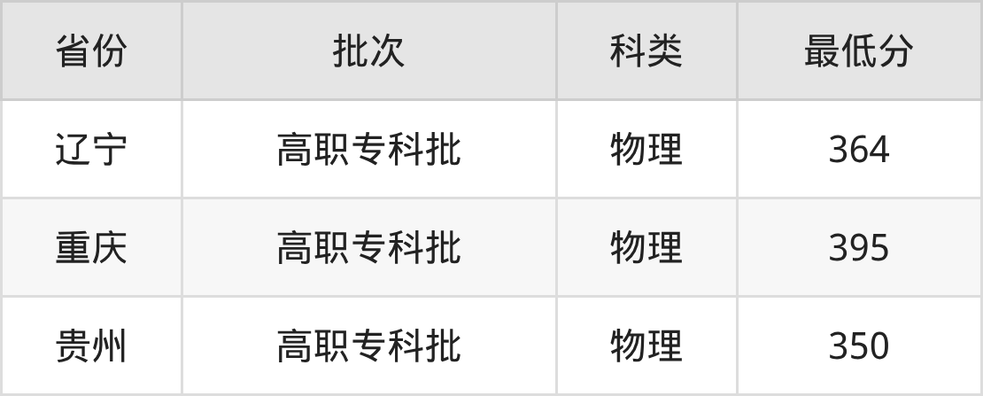 贵州航空职业技术学院智能焊接技术专业在全国各省最低录取分数线为350分(贵州物理类),除此之外,在其余地区的最低分为辽宁物理类364分、重庆物理类395分,以上数据均为2025年数据,供2026年高考生参考。