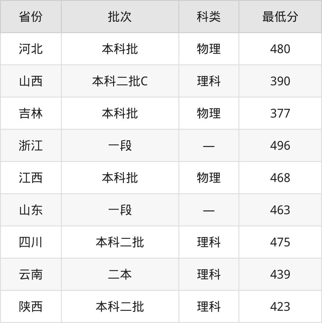 南宁学院计算机科学与技术专业在全国各省最低录取分数线为377分(吉林物理类),除此之外,在其余地区的最低分为河北物理类480分、山西理科390分、江西物理类468分、四川理科475分等,以上数据均为2024年数据,供2025年高考生参考。