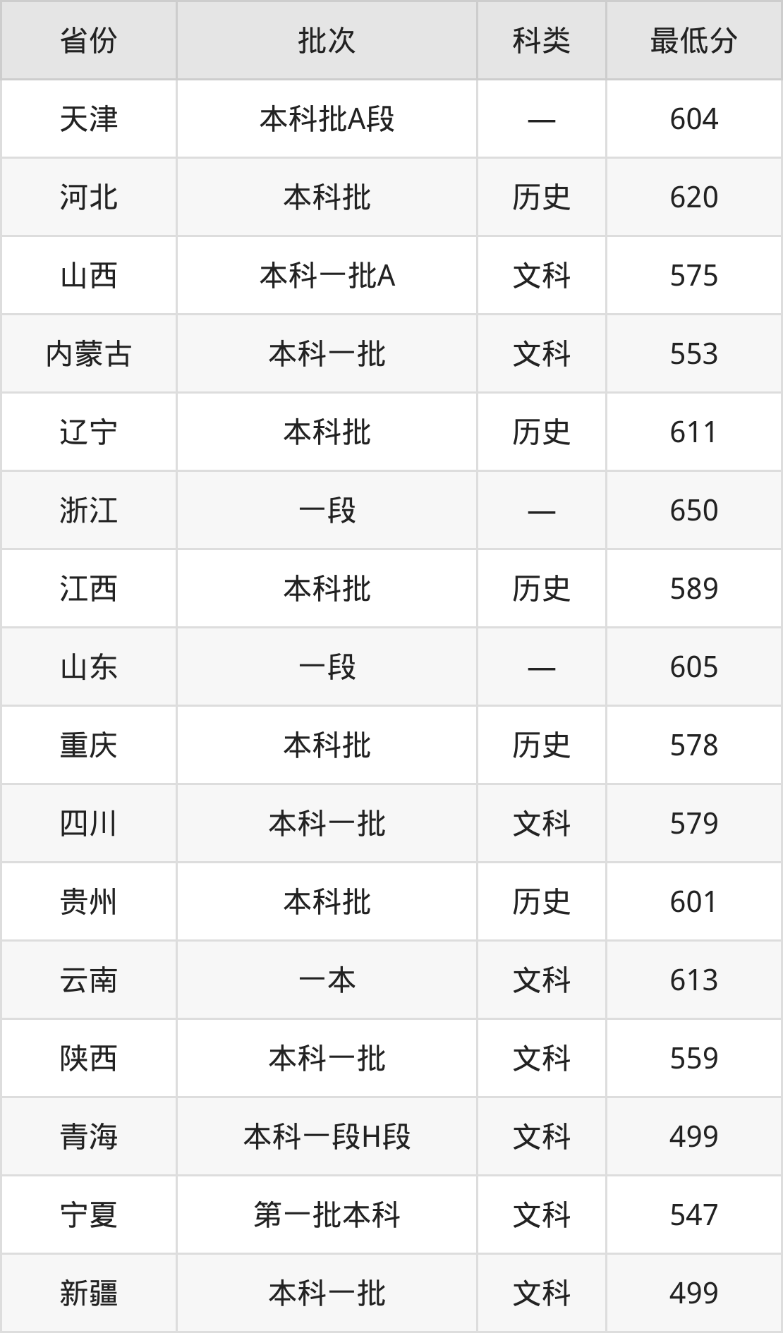 海南大学法学专业录取分数线从499分到650分不等,在部分地区的最低分数线如下: