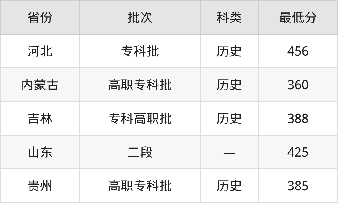 莱芜职业技术学院大数据与会计专业在全国各省最低录取分数线为360分(内蒙古历史类),除此之外,在其余地区的最低分为山东425分、贵州历史类385分、河北历史类456分、吉林历史类388分,以上数据均为2025年数据,供2026年高考生参考。