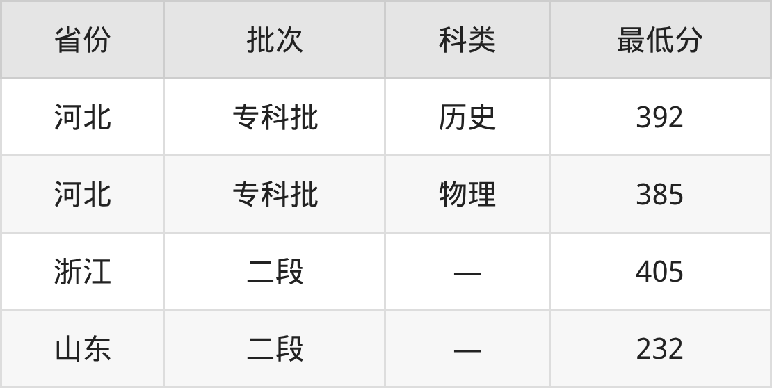 山东现代学院护理专业录取分数线从232分到405分不等,最低分数线如下: