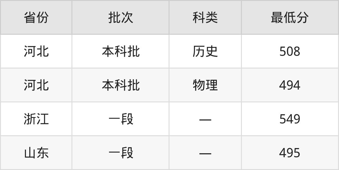 郑州商学院国际商务专业在全国各省最低录取分数线为494分(河北物理类),除此之外,在其余地区的最低分为浙江549分、山东495分,以上数据均为2025年数据,供2026年高考生参考。